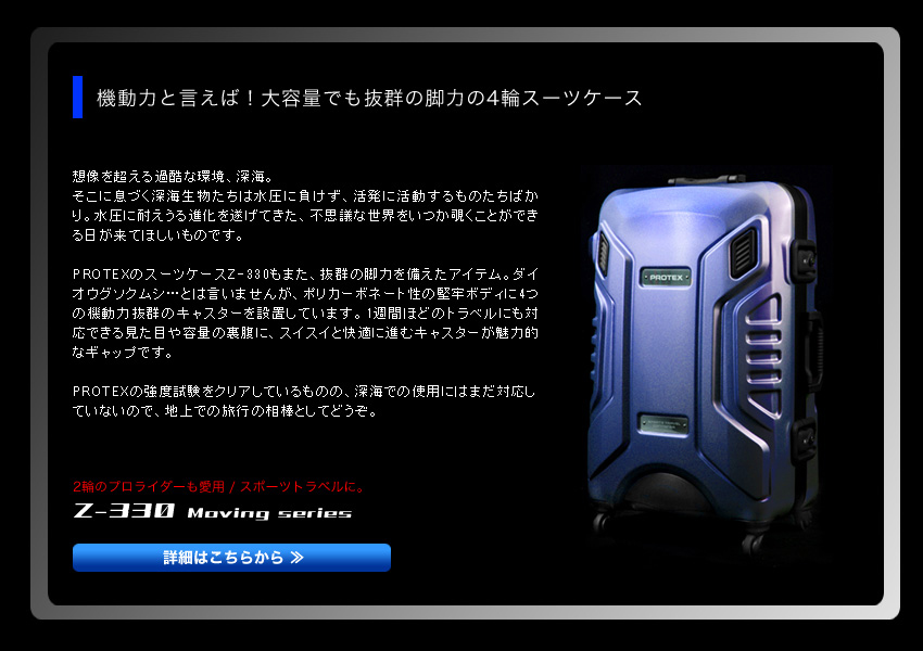 PROTEX(プロテックス)はパーソナルに特化した、あらゆるプロフェッショナルのキャリーニーズに応えるブランド。 スーツケース・キャリーコンテナ・アタッシュなど、ビジネスに始まりトラベル・ダイビング・モータースポーツにいたるまで、プロフェッショナルの傍らには、常にPROTEXがいる。