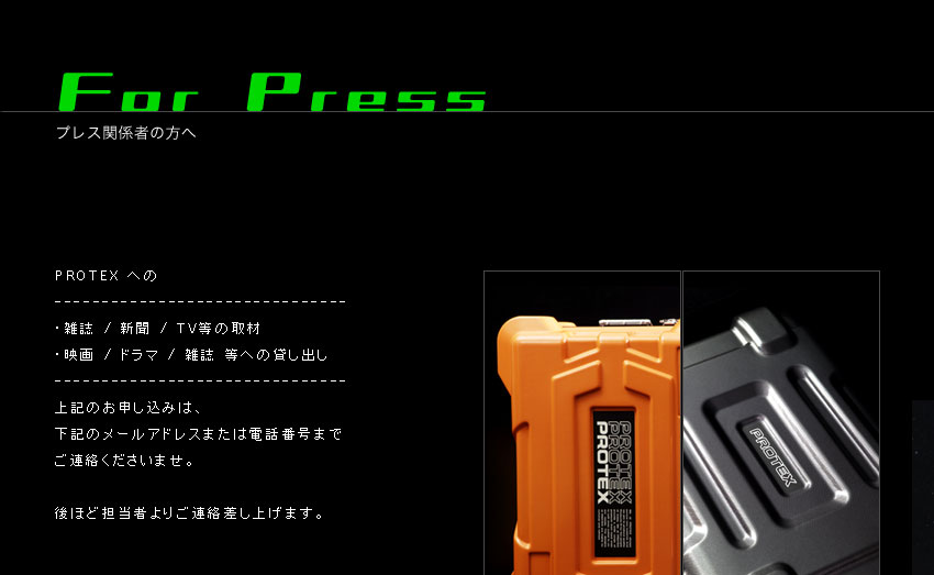 PROTEX(プロテックス)はパーソナルに特化した、あらゆるプロフェッショナルのキャリーニーズに応えるブランド。 スーツケース・キャリーコンテナ・アタッシュなど、ビジネスに始まりトラベル・ダイビング・モータースポーツにいたるまで、プロフェッショナルの傍らには、常にPROTEXがいる。