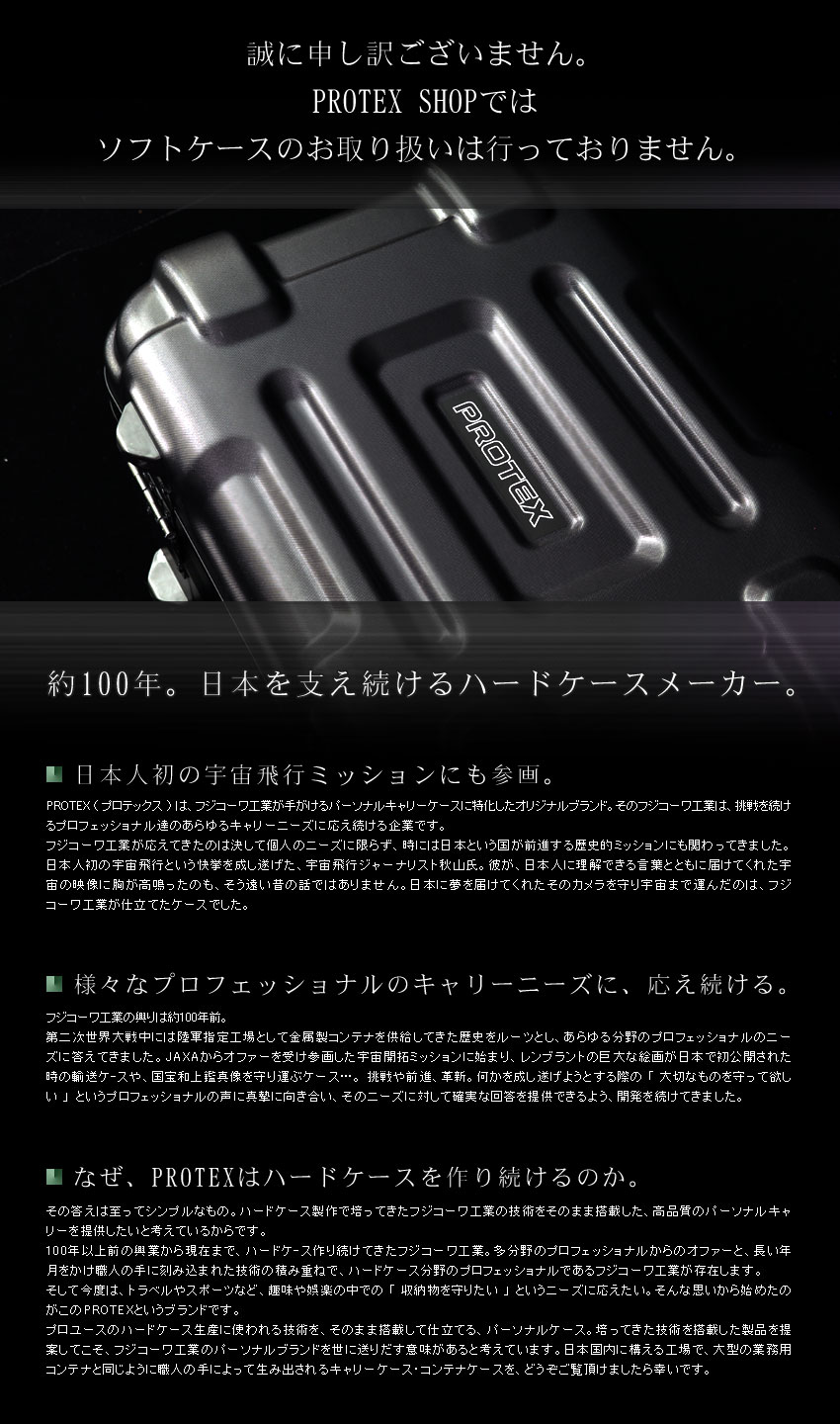 PROTEX(プロテックス)はパーソナルに特化した、あらゆるプロフェッショナルのキャリーニーズに応えるブランド。 スーツケース・キャリーコンテナ・アタッシュなど、ビジネスに始まりトラベル・ダイビング・モータースポーツにいたるまで、プロフェッショナルの傍らには、常にPROTEXがいる。